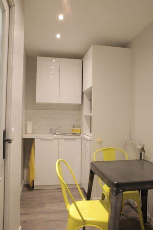 Le fil conducteur choisi a été d’uniformiser les sols et d’assortir les couleurs. Le coin repas a été créé dans l’ancienne salle de bain afin d’optimiser les arrivées d’eau afin de limiter le budget. Le très beau bureau ancien a été mis en valeur par les 2 chaises tulipe du même coloris. Les rangements ont été faits sur-mesure pour un gain de place maximal.