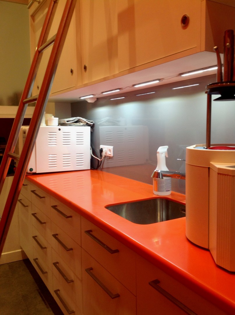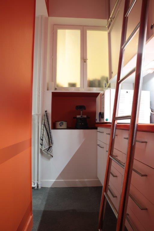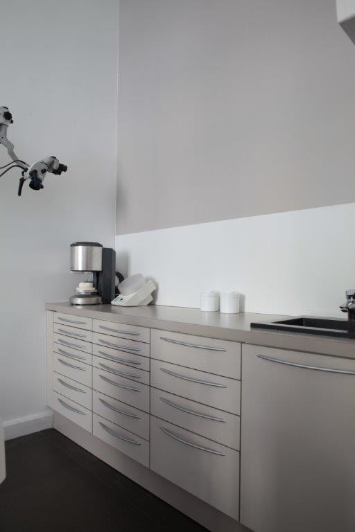 Dans ce projet, le choix des couleurs ainsi que le choix des matériaux était primordial pour respecter le style scandinave demandé par le cabinet dentaire. Les détails ont été travailler avec une décoration soigné et une sélection minutieuse du mobilier. Trucs et astuces Pour pallier à la hauteur du sous-plafond (plus de 4 mètres), nous avons mis en place une échelle coulissante sur toute la longueur de la stérile pour accéder aux rangements en hauteur.