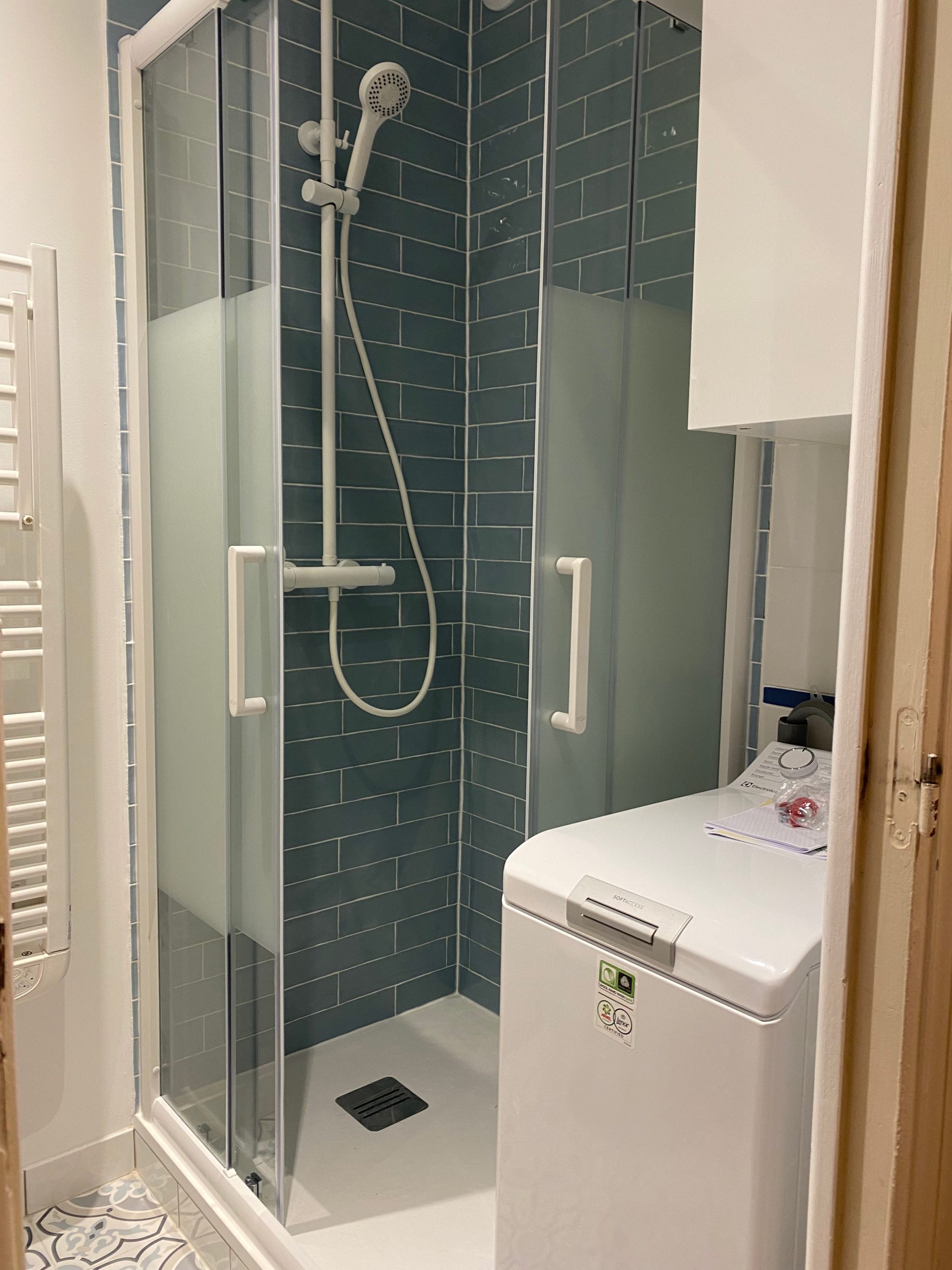 Pour la salle de bain, nous avons refait la douche, le sol et changé la vasque miroir. Nous avons également mis un sèche-serviette ainsi qu’une machine à laver. L’aménagement a été réalisé selon le souhait de la cliente.
